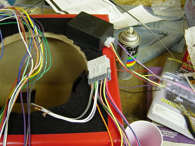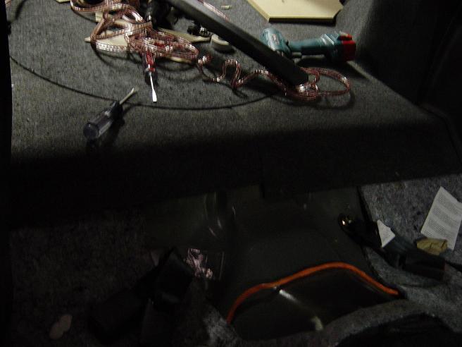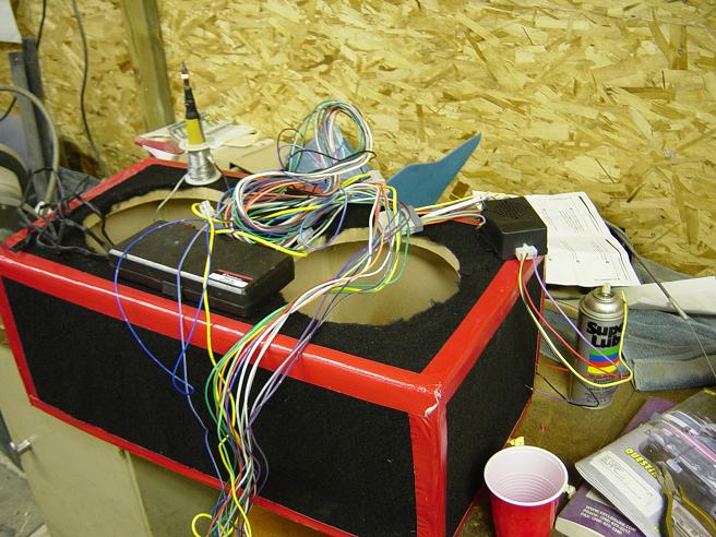 The huge wiring harness for the new stereo on top of the sub box after it was carpeted.